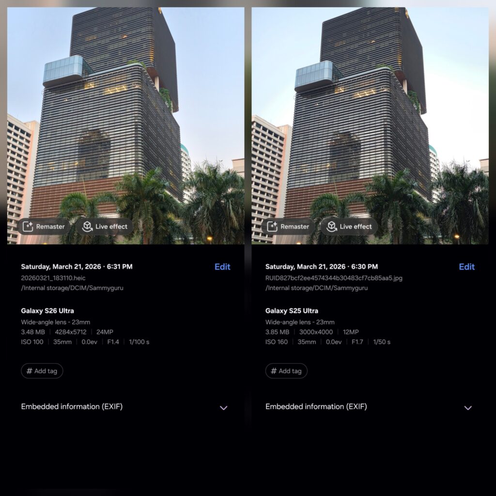 This is a big change from the Galaxy S25 Ultra, where high performance was largely limited to Expert RAW. In Auto mode, the system remained locked to a 12MP output at most zoom levels, although more detail was available from the sensor.