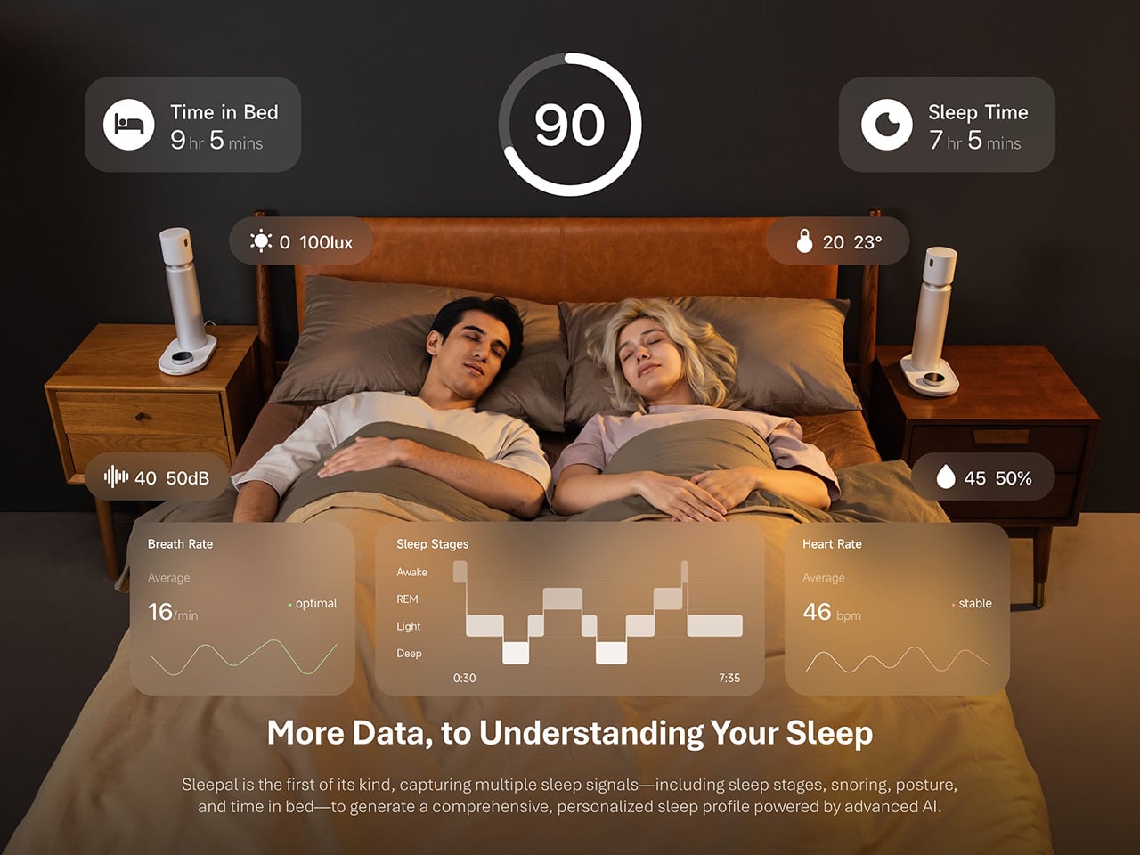 Ironically, wearing a device while sleeping can interfere with what you’re trying to improve. A clock or ring increases physical awareness that makes it difficult to stay still, especially for someone who already has trouble falling asleep. Sleepal addresses that contradiction by embedding tracking technology into something that’s already in your nightstand: the bedside lamp.